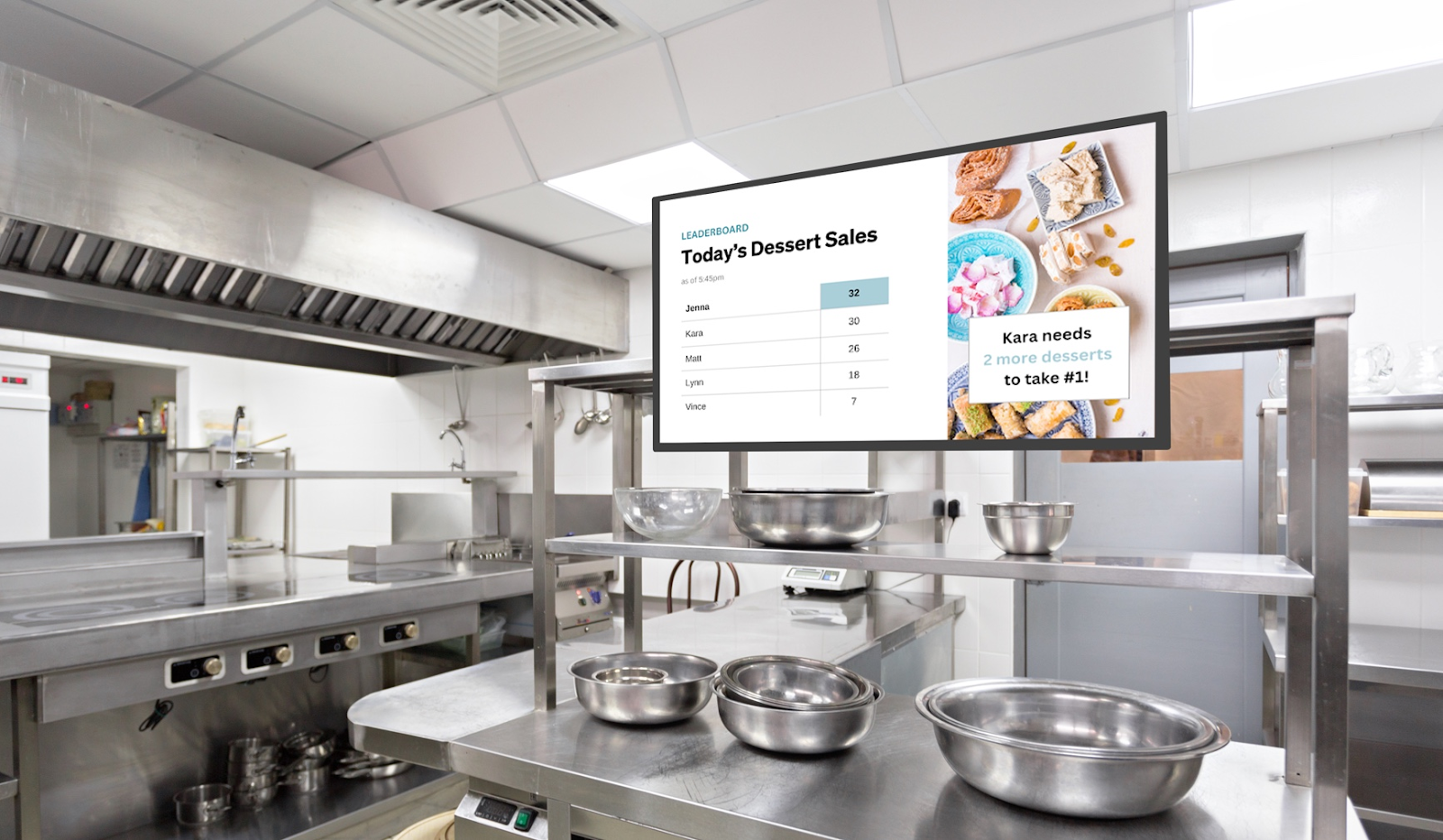 Showing the day’s stats and KPIs is a great way for staff to see how well they’re doing and help boost productivity.